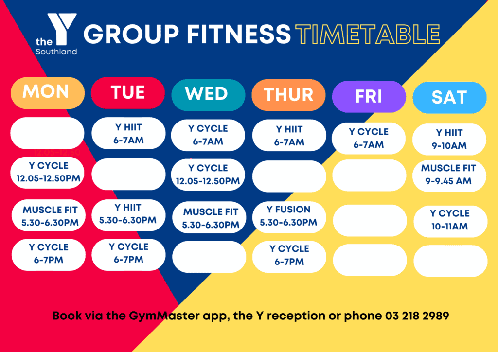 Most classes are held at the Y, but some are at 9 Jenkin Street, Invercargill, so please take note of the timetable which reflects this.